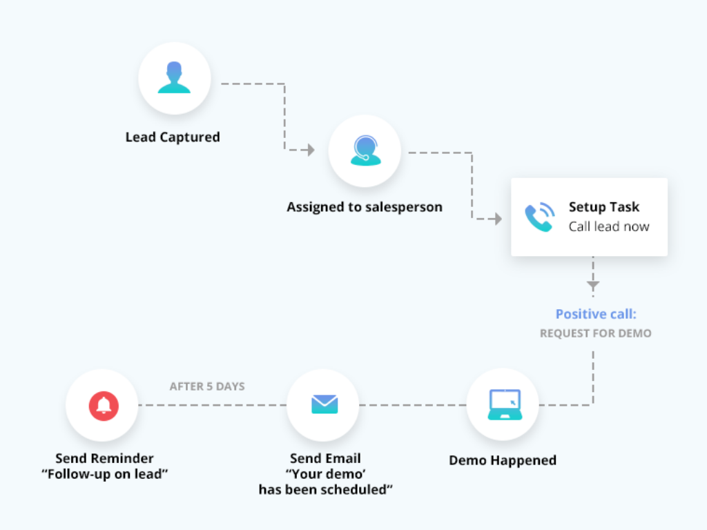 The workflow automation commences once the sales rep has personally communicated with the lead.